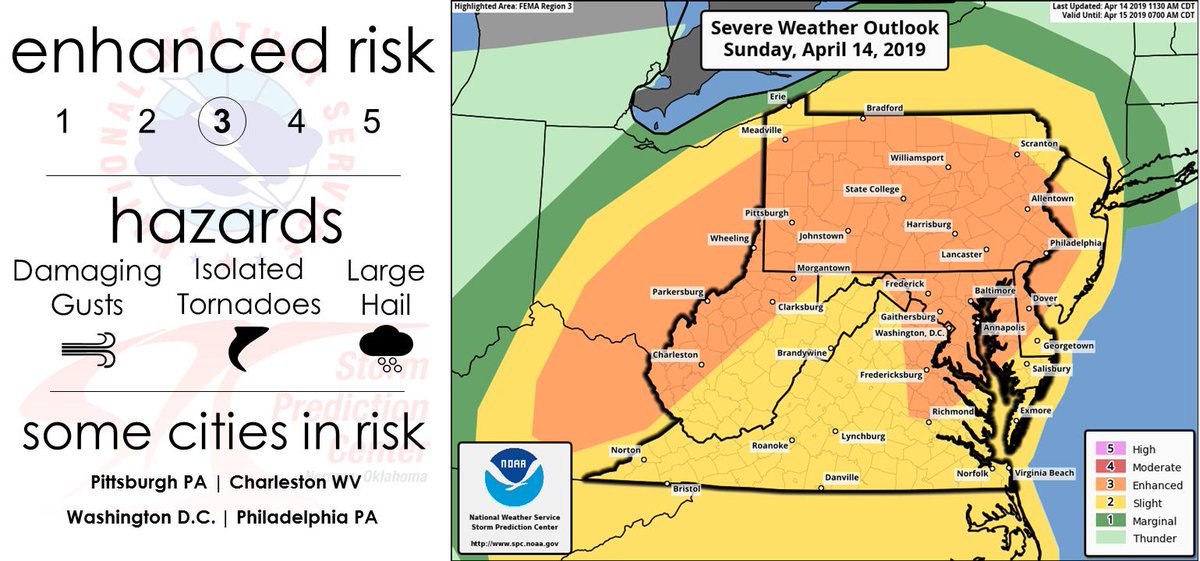 El NWS calificó el riesgo para los estados circundantes durante el domingo como elevado, y a las 17:53 UTC mantenía en pie una alerta de tornado para varias zonas de Georgia y Carolina del Sur, sin descartar vientos de hasta 100 kilómetros por hora y posibles tormentas eléctricas.