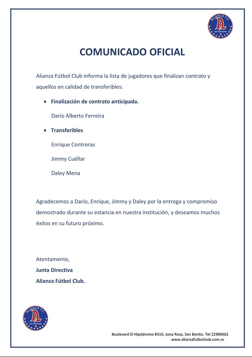 “Agradecemos a Darío, Enrique, Jimmy y Daley por la entrega y compromiso demostrado durante su estancia en nuestra institución, y deseamos muchos éxitos en su futuro próximo”, dijo la dirigencia de Alianza a través de un comunicado.