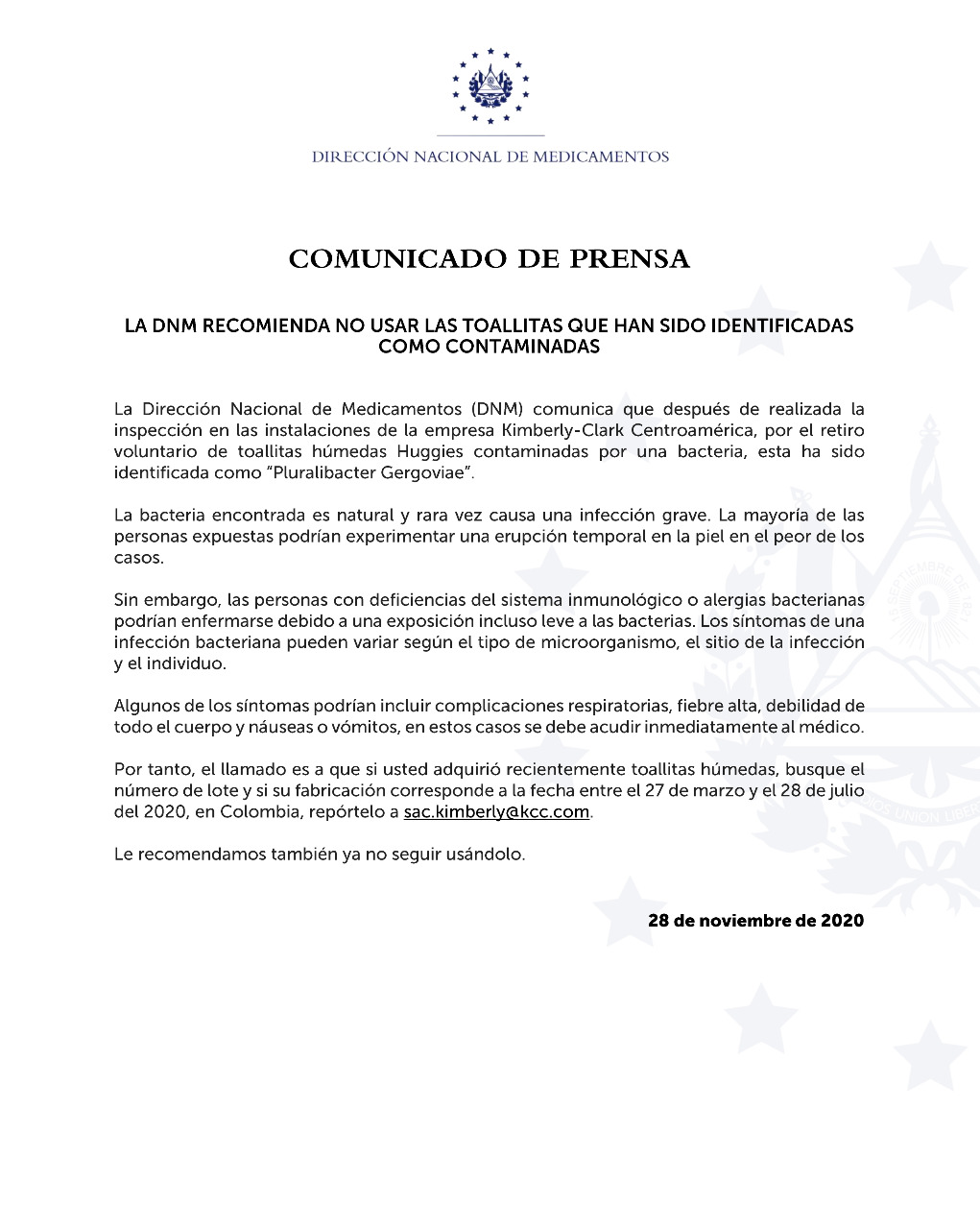 En seguimiento al proceso de retiro de las toallitas húmedas Huggies, la Dirección Nacional de Medicamentos recomienda no usar el producto que haya sido identificado como contaminado. pic.twitter.com/IsdtfYKIiA