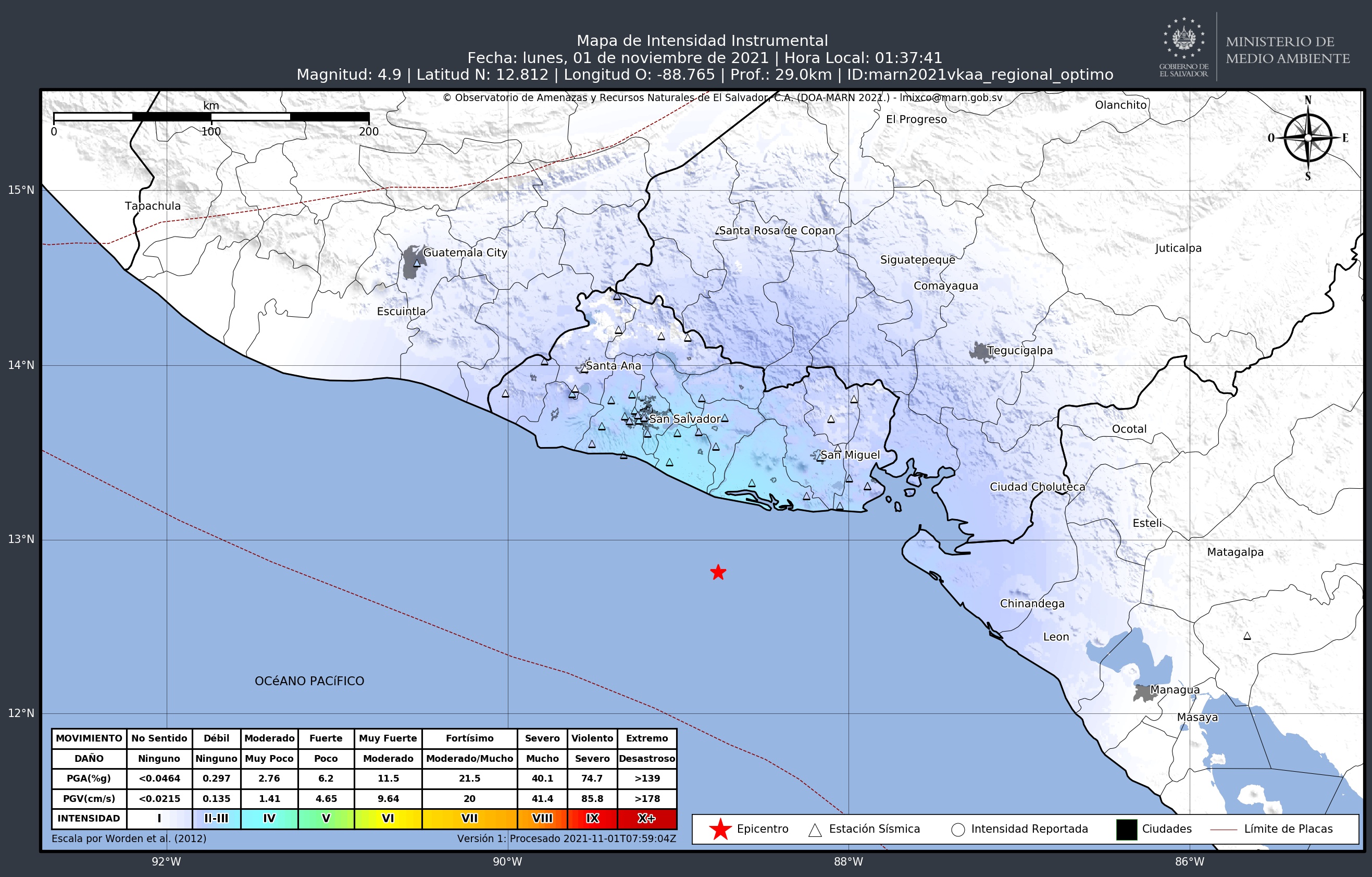 Autoridades del MARN explicaron que según el mapa de intensidad instrumental este temblor, a pesar de la fuerza con la que se percibió en algunas zonas, representó un daño catalogado como “muy poco”.