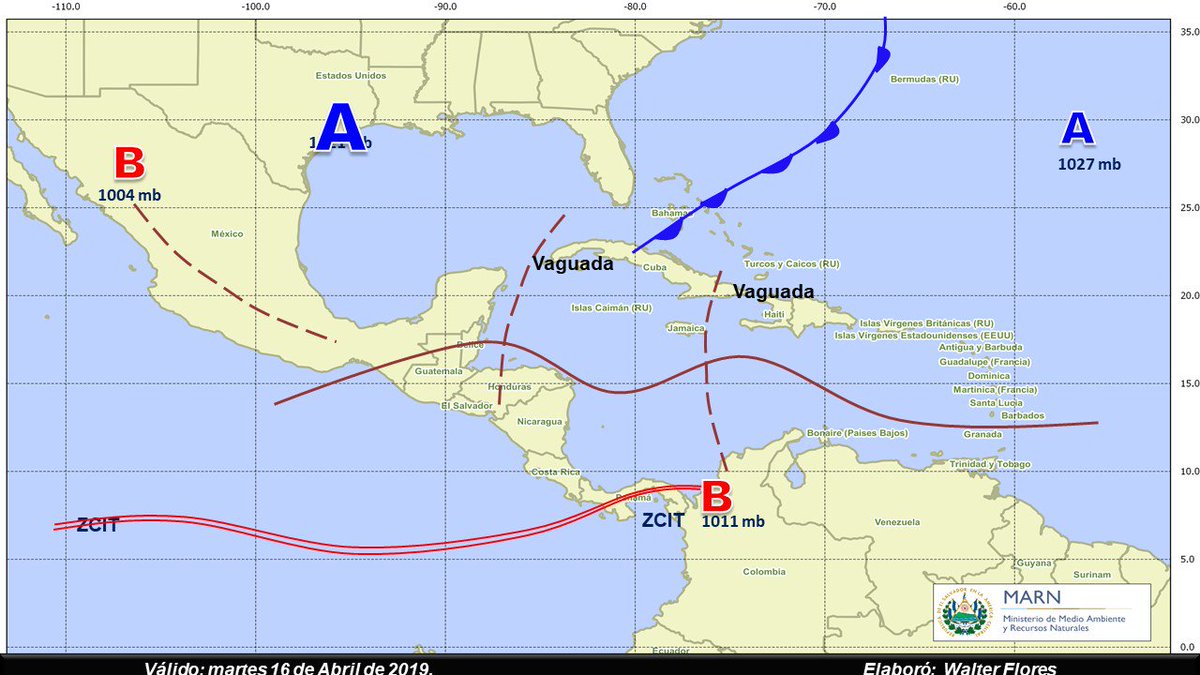 «Mapa de sistemas atmosféricos cercanos a Centroamérica: frente frío al norte del mar Caribe y Vaguada sobre Centroamérica que mantendrá el cielo de poco a medio nublado y probabilidad de lluvia para las áreas montañas del país. Ambiente cálido durante el día», indicó el MARN.