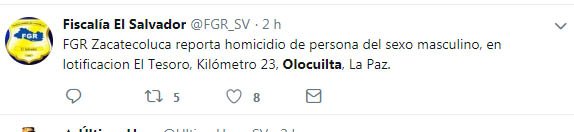 La Fiscalía General de la República (FGR) dio a conocer, la tarde de este lunes, la localización de un cuerpo atado de las manos en la calle principal de la lotificación El Tesoro ubicada en el Kilómetro 23 de la carretera antigua a Zacatecoluca, municipio de Olocuilta, La Paz.