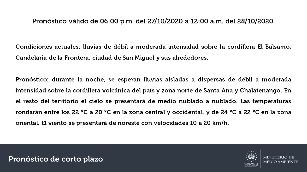 Mientras que en el resto de El Salvador Medio Ambiente nada más se espera que el cielo esté de medio nublado a nublado.