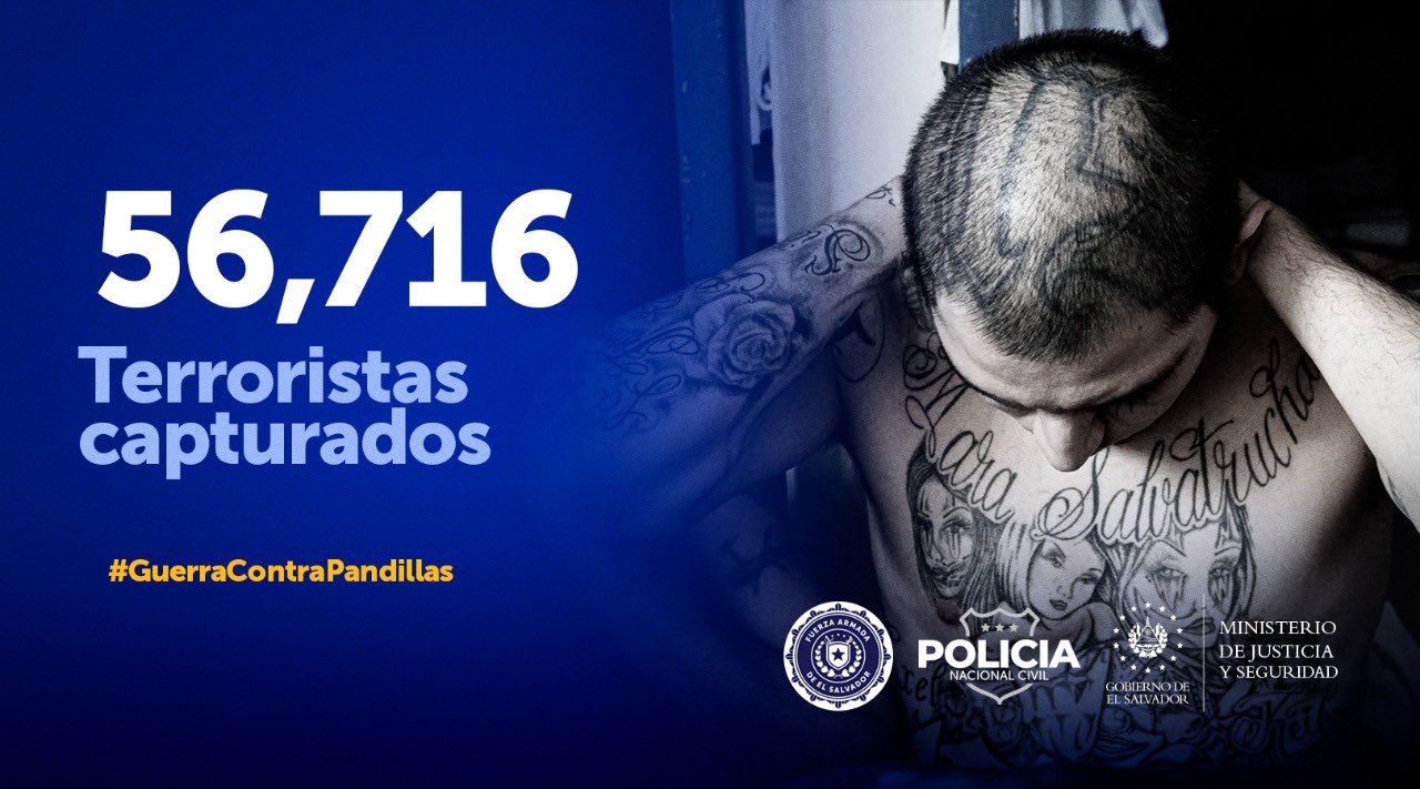 Un total de 56,716 pandilleros y sus colaboradores han sido capturados durante el régimen de excepción, según las cifras oficiales publicadas este viernes por el Ministerio de Seguridad Pública.