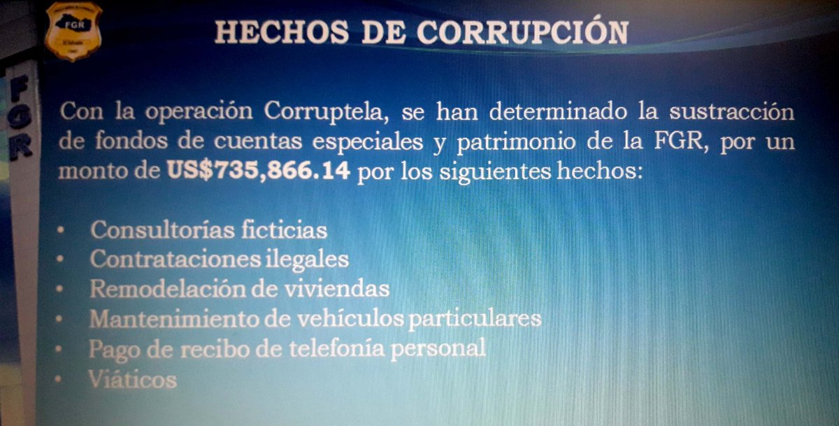 Esta investigación ha sido denominada «Operación Corruptela» y específicamente, se ha dicho que se trata de la «sustracción de dinero de las cuentas especiales y del patrimonio de la Fiscalía General de la República» por más de 735 mil dólares.