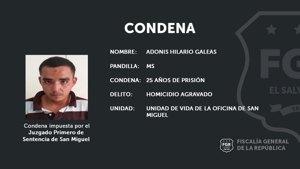 Fiscales de la Unidad de Vida de la oficina de San Miguel demostraron que Galeas, fue coautor en el homicidio del ciudadano Néstor Andrés Rivera Paiz, por lo que recibió una condena de 25 años de cárcel.