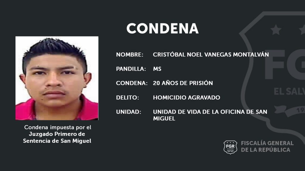La Fiscalía General de la República (FGR) en coordinación con la Unidad de Vida de la oficina de San Miguel demostraron que Cristóbal Noel Vanegas Montalvo, miembro de la Mara Salvatrucha (MS-13), fue coautor en el Homicidio Agravado en contra de Coronado Rivera.