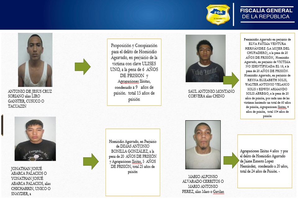 Por estos crímenes fueron condenados: José Rubén López Umaña a 122 años de prisión. Saúl Antonio Montano a 104 años, David Antonio López Palacios a 95 años, y Darwin Steve Castellanos Barrera a 81 años de prisión.