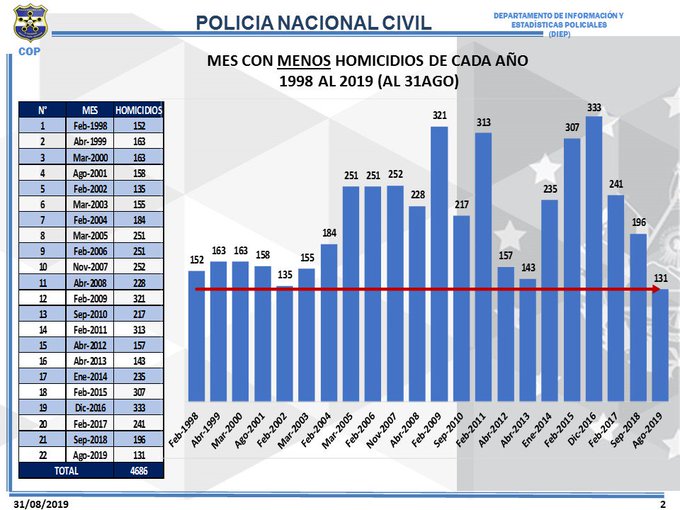 Termina agosto y podemos confirmar que hemos cerrado el mes con menos homicidios desde los Acuerdos de Paz.