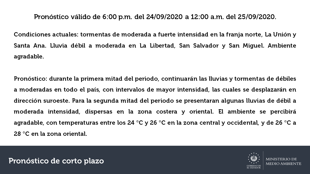 Para las primeras horas de esta noche de jueves, las lluvias y tormentas continuarán de débiles a moderadas continuarán en todo el país, dijo el Ministerio de Medio Ambiente y Recursos Naturales (MARN).