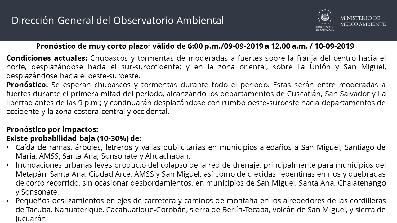 Asimismo, existen probabilidades bajas de que las lluvias ocasionen la caída de ramas, árboles, letreros y vallas publicitarias en municipios aledaños a San Miguel, Santiago de María, el Área Metropolitana de San Salvador (AMSS), Santa Ana, Sonsonate y Ahuachapán.