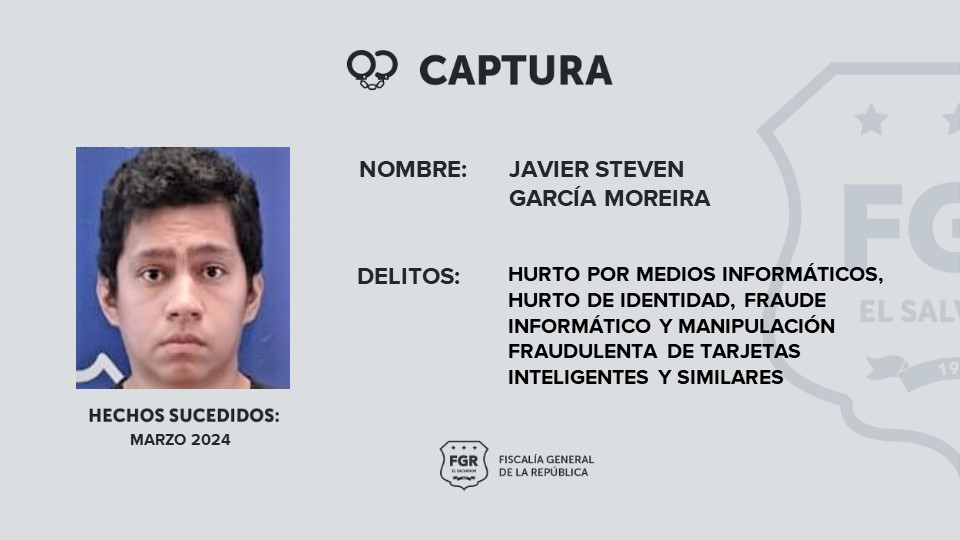 La Fiscalía General de la República (FGR) ordenó y ejecutó la captura de Javier Steven García Moreira acusado de suplantar la identidad de varias personas.