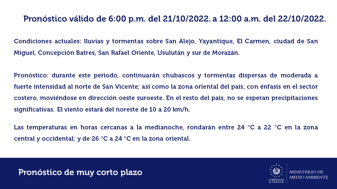 Según el reporte, durante este período, continuarán chubascos y tormentas dispersas de moderada a fuerte intensidad al norte del departamento de San Vicente, así como la zona oriental del país, con énfasis en el sector costero, moviéndose en dirección oeste-suroeste.