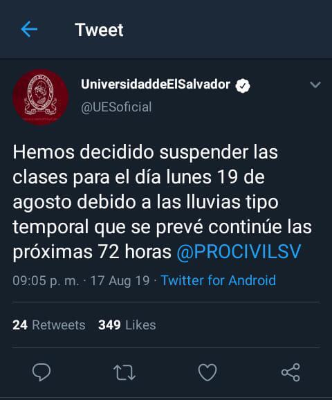 “Autoridades de la Universidad de El Salvador no han suspendido actividades académicas ni administrativas para el lunes 19 de agosto. Solicitamos a la comunidad estudiantil hacer caso omiso de esta imagen”, aclaró la casa de estudios superiores.